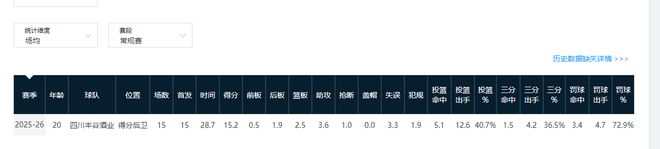 本赛季15次出场后,段睿骐场场首发,场均可出场28.7分钟,场均出手12.6次,这两项数据均为队内本土球员最高。他也不负众望,给球权就能做到消化,目前他场均可砍下15.2分2.5篮板3.6助攻。段睿骐尺寸足,而且掌握国内大多数后卫不具备的中距离跳投技术,他的上限应该会很高。