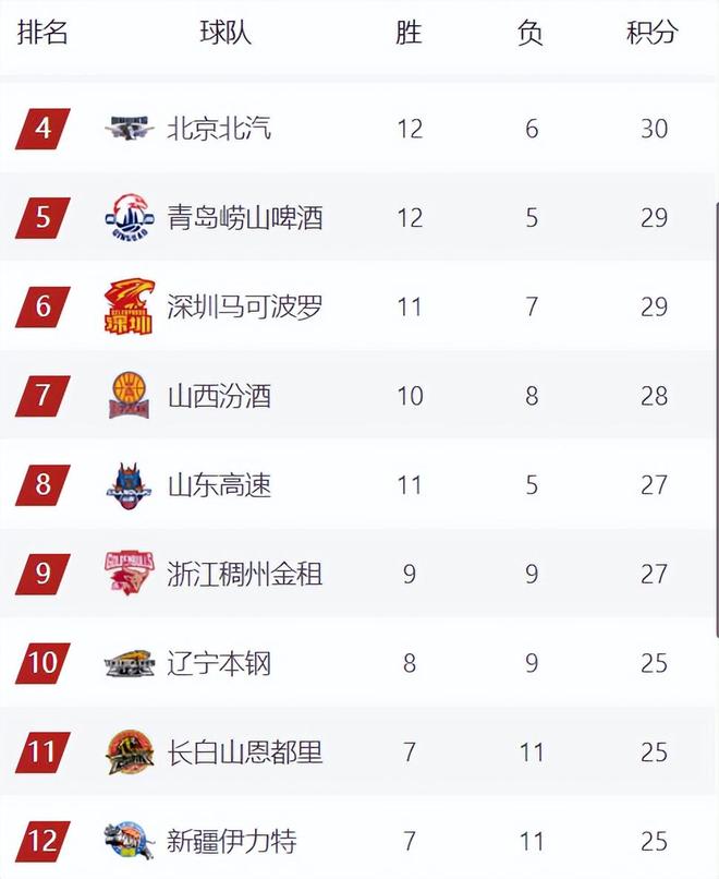 目前前8的排名其实变化不大,主要是第9-12的排名竞争比较激烈,新疆现在是2连胜暂时来到了第12,反弹势头强劲,近期有望把吉林、辽宁、宁波拉下去。