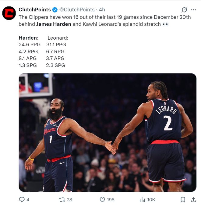 很多人都会觉得科怀-伦纳德在12月20日后的爆发才是快船战绩提升的关键,因为小卡那个阶段场均31.1+6.7+3.7+2.3,但也有美媒认为哈登才是快船的真舵手。