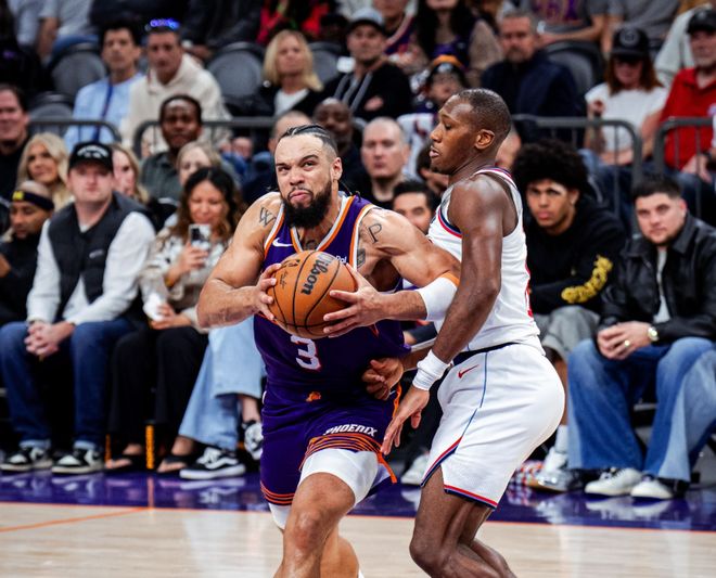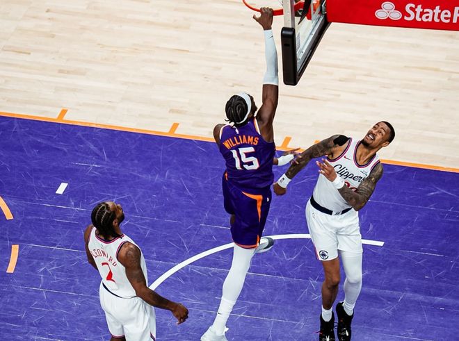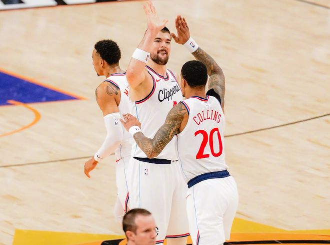 中段祖巴茨高举高打,吉莱斯皮和科林斯外线对狙,奥尼尔肘击祖巴茨,被吹一级恶意犯规,祖巴茨真怒了,直接坐打生吃马威!吉莱斯皮续上三分后,邓恩左手打阿伦脖子,也吃到一级恶犯!后半段古德温和阿伦继续下三分雨,危急时刻祖巴茨和米勒内外开花,三节打完,快船85-71领先太阳。决战第四节,伦纳德高难度突破上篮打3分,随后米勒续上三分球,分差到20分!此后米勒和巴图姆继续外线轰炸,大洛背扣,快船最多领先23分。太阳一直在努力追分,伦纳德跳投稳定节奏。