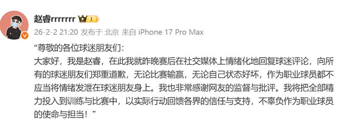 赵睿不当言论后致歉:情绪化回复,不应将情绪发泄在球迷朋友身上