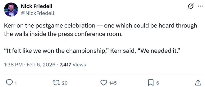 虽然对球队排名影响不大,但对于处于下行势头的勇士队来说,这一场含金量十足的胜利无异于一剂强心针。