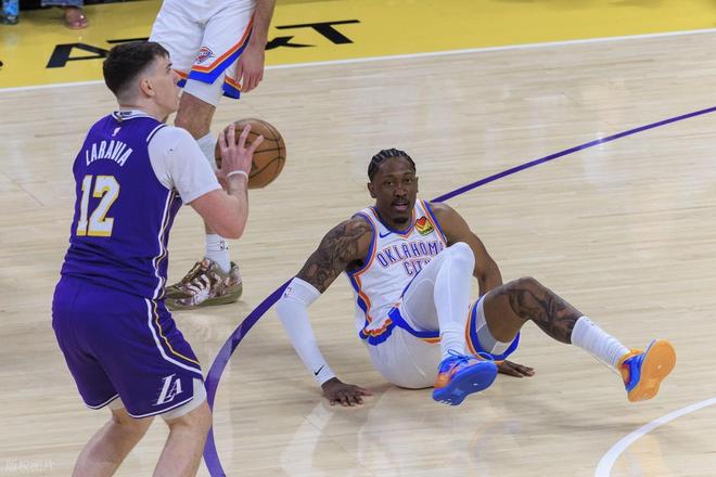 下半场易边再战,第三节上来雷霆又把分差拉开到了两位数,斯玛特三分止血,拉拉维亚三分再中,追到73-76只落后3分,雷霆暂停。回到比赛,湖人又是一波小高潮,一鼓作气成功反超队史7分8分。但雷霆并没有慌乱,而是稳扎稳打,一点点将分差抹平。里夫斯吃到技术犯规,卡鲁索顶着防守投进三分,三节结束湖人91-93落后2分。