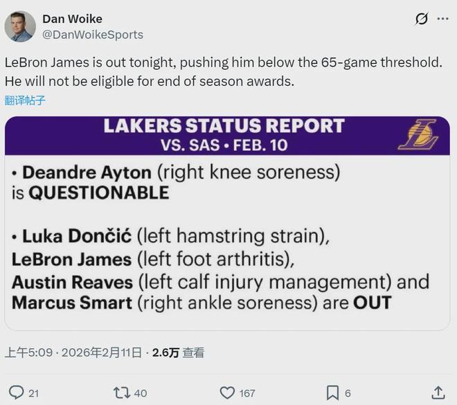 詹姆斯无法出战65场常规赛以上,失去常规赛重要奖项的评选资格。连续21年入选最佳阵容的历史纪录,正式终结了。詹姆斯生涯首次入选最佳阵容是2004-05赛季,当时跟他一起入选二阵的有加内特、韦德、雷阿伦和斯塔德迈尔。