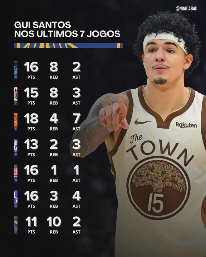 先看一组数据对比:过去7场比赛,勇士前锋吉-桑托斯场均15分5.1篮板3.1助攻1.3抢断1盖帽,投篮命中率62.7%,三分命中率43.3%。追梦格林场均7.3分4.7篮板4.3助攻0.9抢断0.3盖帽,投篮命中率34.6%,三分命中率32.5%。