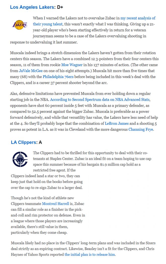 翻开当时ESPN对这笔交易的评价,湖人只有D+,快船则得到了A,也能说明这笔交易有多么得让人意外。