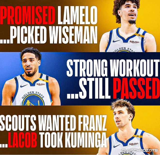 库明加的失败,只是勇士选秀灾难的冰山一角。追根溯源,一切都要从2020年那个毁掉球队未来的榜眼签说起。19-20赛季勇士主动摆烂,赌来一枚宝贵的榜眼签,彼时科尔与教练组一致看好两位后卫:拉梅洛·鲍尔与泰雷斯·哈利伯顿。三球的传球视野、节奏把控与勇士传切完美契合,哈利伯顿的冷静组织、精准投射更是库里接班人的理想人选。可勇士高层偏要一意孤行,执念于“补内线短板”,无视怀斯曼仅打3场NCAA、长期缺训的风险,执意选中这位天赋中锋。