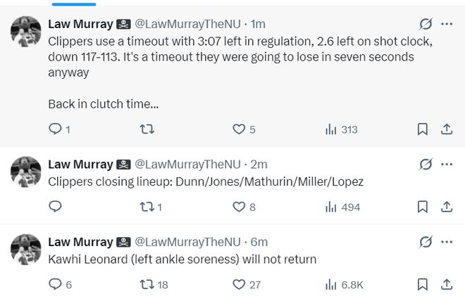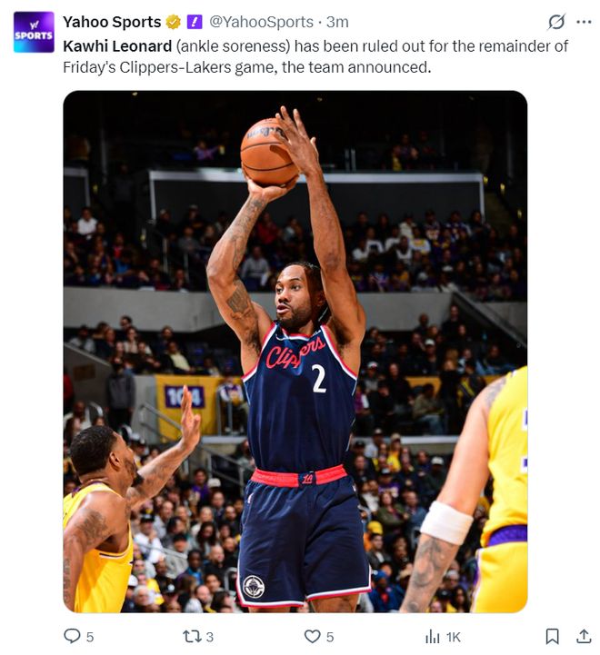 根据快船队记劳里-穆雷的报道,伦纳德是左脚踝酸痛本场比赛将不会回归。