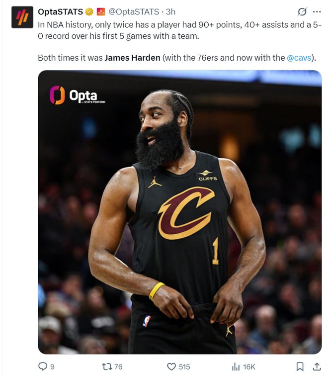 根据数据媒体的统计,一名球员换队后的前五场比赛,能得到90分以上、助攻数超过40次以上且球队战绩5胜0负的球员只有詹姆斯-哈登,NBA历史上出现了两次都是哈登,上一次是出现在费城76人。