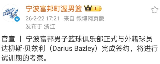 宁波富邦官方宣布,上赛季在广东宏远效力的贝兹利重返CBA赛场,由于伤病,贝兹利已经休息了半年的时间。宁波富邦同时换掉了大外援马丁,按照目前的走势来看,宁波富邦还是有非常大的机会冲击季后赛。