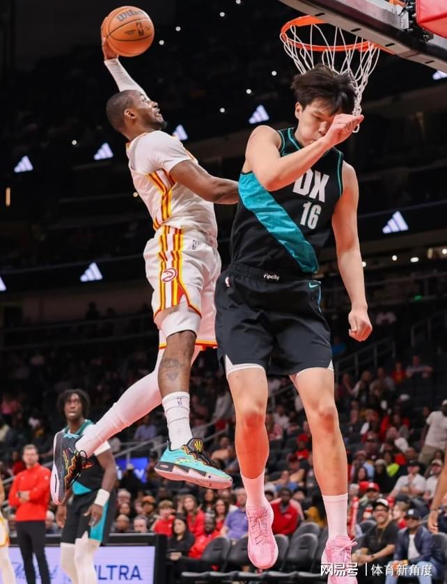 一快速反击的时候,他像踩了弹簧一样垫步起飞,单臂来了个超级大风车暴扣,那架势,仿佛要把篮筐都给扯下来;另一记更猛,底线接球后,他原地“嗖”地一下迅猛腾空,左手狠狠地砸扣在杨瀚森头上,那场面,简直霸气侧漏!