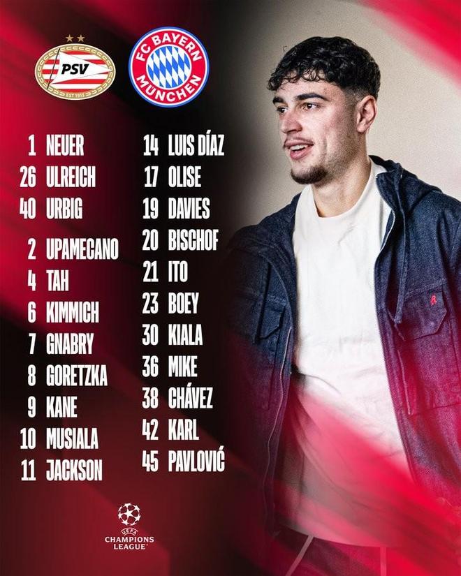 拜仁官方公布了欧冠联赛阶段第8轮,客战埃因霍温的大名单。凯恩领衔,于帕梅卡诺、格纳布里、博埃回归。