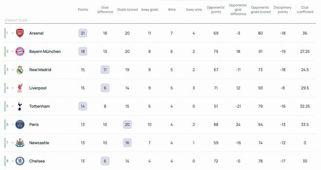 根据规则,欧冠联赛阶段前八名直接晋级十六强;9-24名进入到淘汰赛附加赛,其中9-16名为种子队,17-24名为非种子队;25-36名直接淘汰;不会再有降级到欧联的规则。