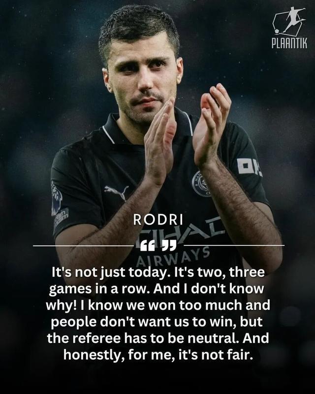 英超第24轮,曼城在客场2-2战平热刺,近6轮英超比赛只赢1场,在积分榜上已经落后领头羊阿森纳多达6分。本场比赛,主场坐镇的热刺可谓是残阵出击,由于伤病危机,热刺有九名一线队球员缺席比赛。但曼城在2-0领先的情况下,遭到热刺的顽强逼平。而在本场比赛中,当值主裁判的多次判罚引发争议,赛后曼城队长罗德里对此非常不满,他直言不讳地批评了裁判表现。