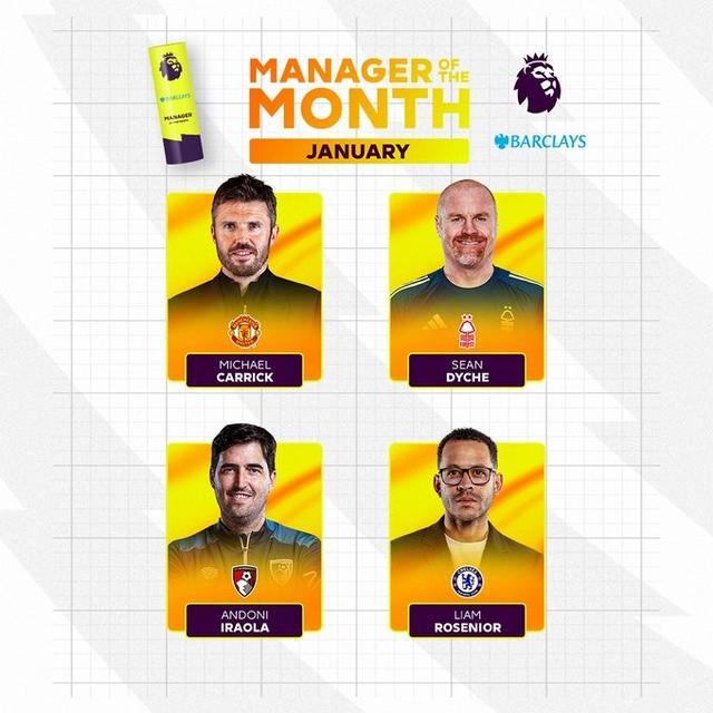 北京时间2月5日,英超官方公布了1月最佳主教练的候选名单,其中曼联主帅卡里克、森林主帅戴奇、伯恩茅斯主帅伊劳拉、切尔西主帅罗塞尼尔在列。