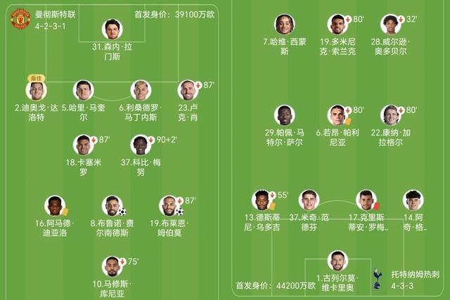 曼联本场面对力求保级的热刺,库尼亚突前、身后是阿马德-迪亚洛、B费和姆伯莫。热刺派上哈维-西蒙斯、索兰克和奥多贝尔。