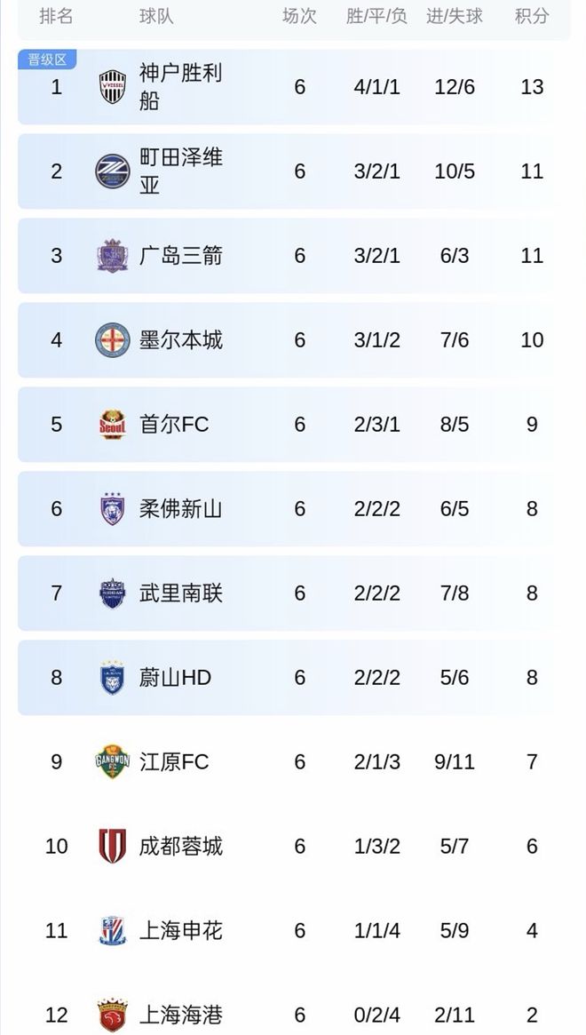 亚冠精英赛东西亚分区,每个分区12支球队参赛,前8名晋级淘汰赛。在目前的亚冠东亚积分榜上,神户胜利船13分,町田泽维亚11分,广岛三箭11分,日职联3支球队包揽前3名。墨尔本城10分第4,首尔9分第5,柔佛新山、武里南联以及蔚山HD同为8分,排名第6-8位。而江原7分,蓉城6分,申花4分,海港2分,排名第9-12位。