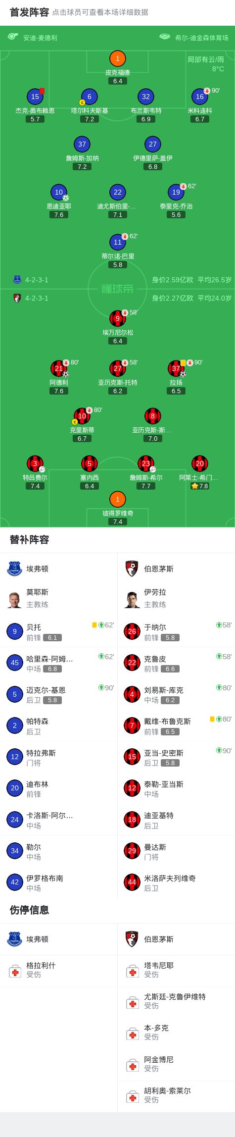 第61分钟,特吕费尔左侧传后点,拉扬头球破门扳平,伯恩茅斯1-1埃弗顿