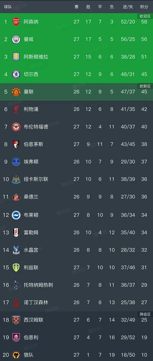 英超最新积分榜
