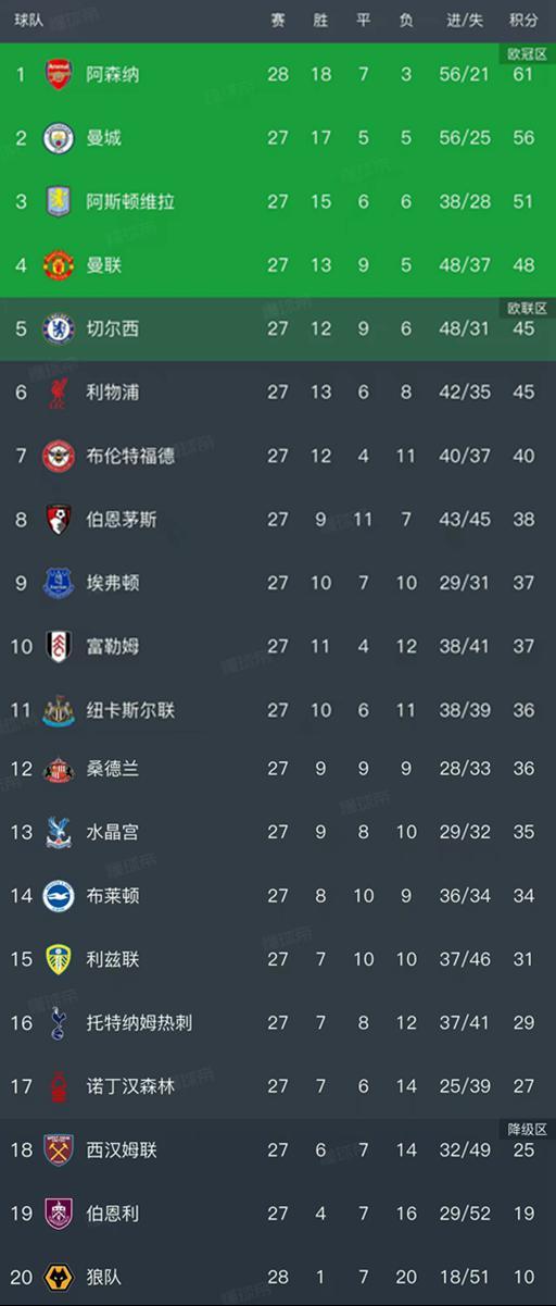 英超最新积分榜