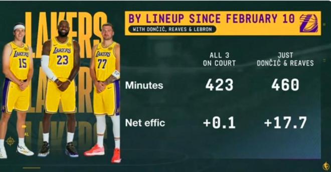 根据数据统计显示,东契奇加盟至今,当詹姆斯、里夫斯、东契奇同时在场的423分钟里面,湖人队净效率仅为+0.1,而在东契奇与里夫斯携手带队的460分钟里面,湖人净效率高达+17.7。